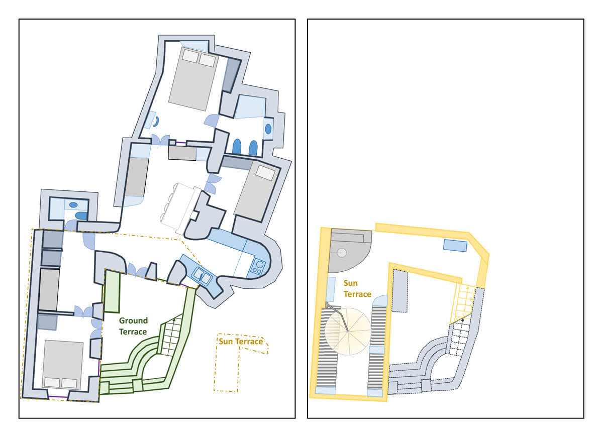 Santoniro is built at the highest part of the Caldera. That unique place on earth, created by a legendary volcanic eruption and immortalized via myths that blend with history. From the Santoniro private sun terrace you can enjoy panoramic views of the breathtaking Volcano, the sun-washed Aegean, the electrifying sunset and moonlight. A separate ground terrace allows you to enjoy shade, that rare commodity in the Cyclades, for the best part of the day.